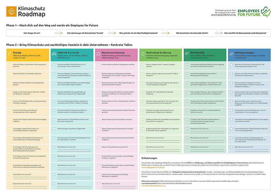 Interaktiv auf der Website von Employees for Future oder als PDF erfüllt die Employee-Roadmap ihre Funktion als hilfreiche Schritt-für-Schritt-Anleitung für mehr Klimaschutz in Unternehmen.